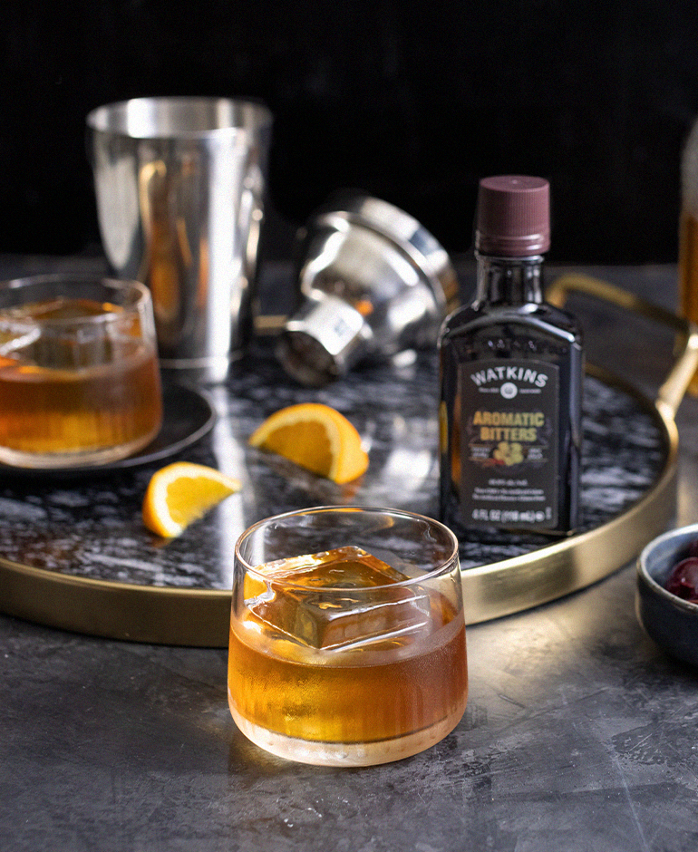 Combine the Watkins Aromatic Bitters, Pure Vanilla Extract, iced tea, simple syrup, orange peel, and a splash of water in a cocktail shaker. Shake for a few seconds.